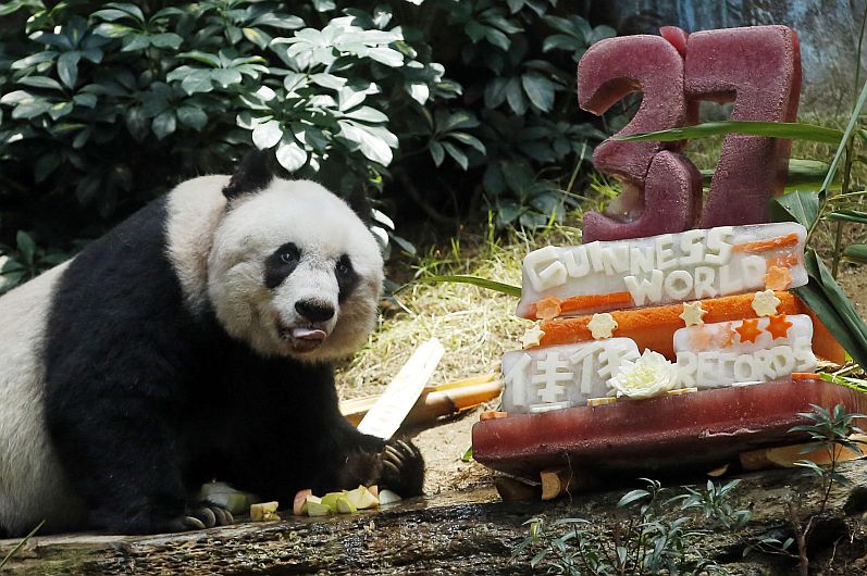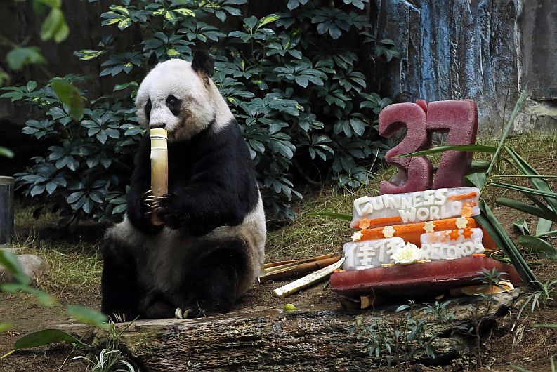 - Giant panda Jia Jia tastes her birthday cake made with ice and vegetables at Ocean Park in Hong Kong, Tuesday, July 28, 2015 as she celebrates her 37-year-old birthday. Jia Jia broke the Guinness World Records title for Oldest Panda Living in Captivity» on Tuesday. (AP Photo/Kin Cheung)